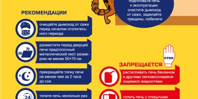Чтобы избежать перекала печи рекомендуется топить ее два-три раза в день. Ни в коем случае не используйте при растопке легковоспламеняющиеся и горючие жидкости. За 2 часа до отхода ко сну топку печи следует прекратить. Перед топочной дверцей на полу необходимо прибить металлический лист, тем самым исключив возможность загорания деревянного пола от выпавших раскаленных углей. Его размер должен быть не менее 50х70 см. К сожалению, больше половины «печных» пожаров происходит в тех домах, где живут пожилые люди. Не каждому пожилому человеку под силу самостоятельно привести в порядок печное отопление. Поэтому детям необходимо позаботиться о своих родителях и привести домовладение в пожаробезопасное состояние.